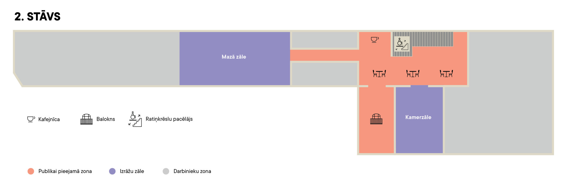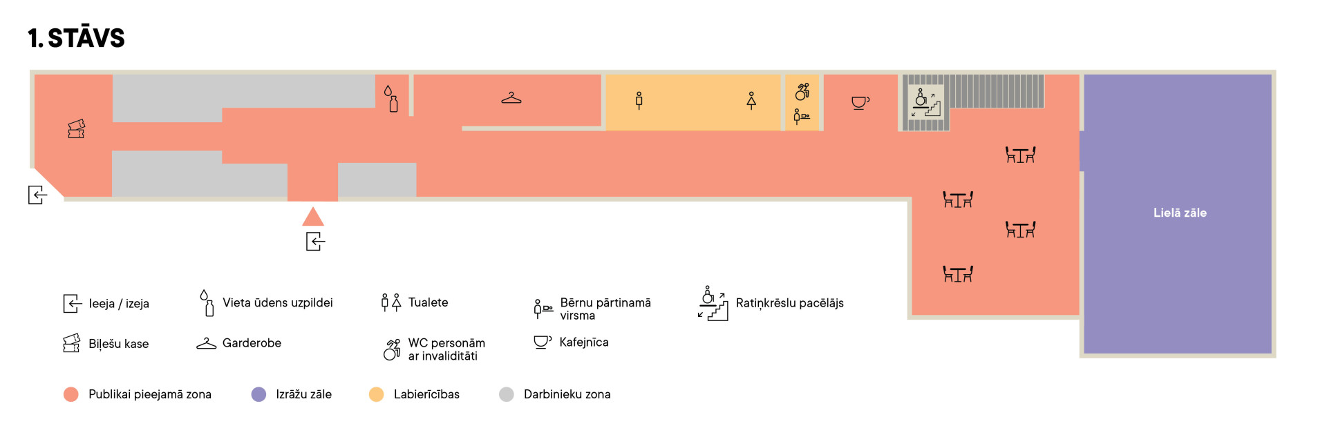- Pirmajā stāvā pieejama garderobe, labierīcības cilvēkiem ar kustību traucējumiem, kafejnīca un Lielā zāle.